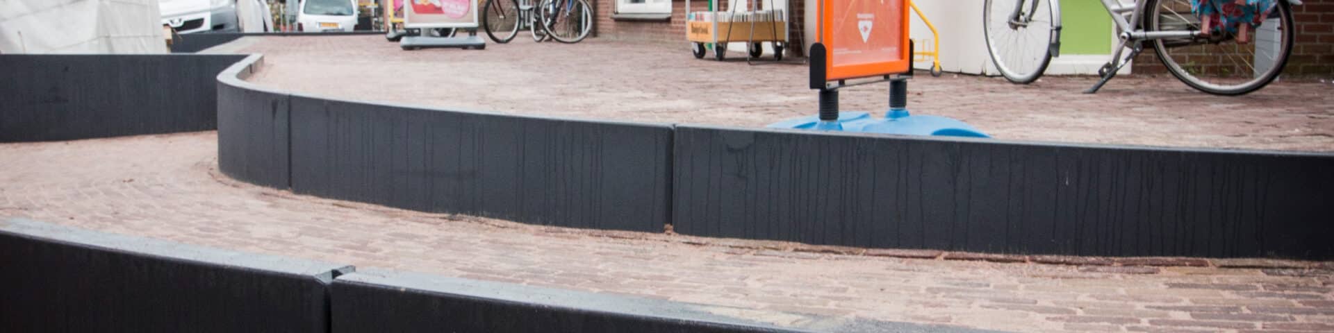 Bosch Beton leverde antracietkleurige keerwanden voor de herinrichting van het buitengebied bij TU Delft. Onder andere voor zitelementen en een hellingbaan.